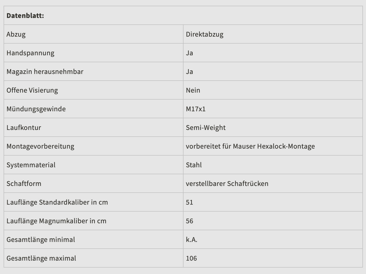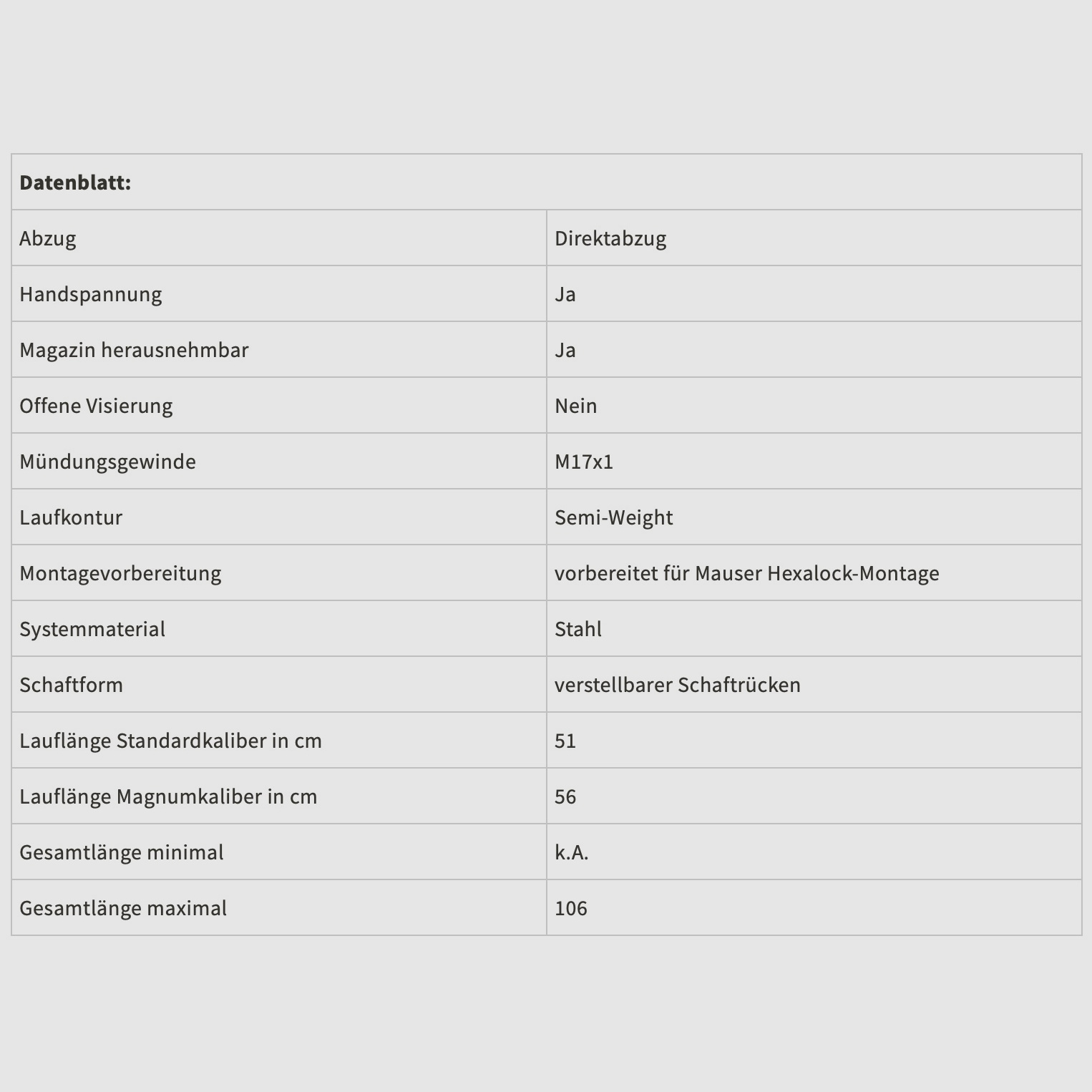 MAUSER 80111221 Repetierbüchse Mauser 12 BIG MAX .308 Win. höhenverstellbarer Schaftrücken für zielsicheren Anschlag sichere Handspannung Verriegelung direkt im Lauf kaltgeschmiedeter Solid-Präzisions-Lauf Schaft für Rechts- und Linksschützen geeignet, Kammerstängel rechts Die Mauser M12 Big Max ist die konsequente Weiterentwicklung der M12 Max mit sehr robustem Lochschaft aus unverwüstlichem Schichtholz, höhenverstellbarem Schaftrücken, massivem 51 cm langen Solid-Lauf mit Mündungsgewinde. Sie ist spezialisiert auf große Aufgaben, bleibt dank Lochschaft aber dennoch schnell in Anschlag zu bringen. Ideal also für die Jagd auf Sauen oder andere bewegte Jagden. Der stabile Lochschaft bietet perfekte Ergonomie und intuitive Präzision dank beidseitiger Handballenausformung. Er besteht aus hochwertig behandelter Buche. Der steile Pistolengriff sorgt jederzeit für eine entspannte Handhaltun...